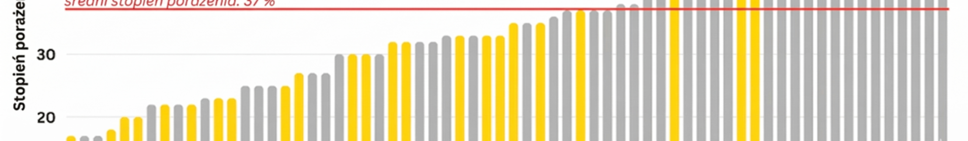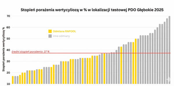 Grafika 2: Ocena porażenia przez Werticiliozę w stacji doświadczalnej PDO (Polskie Doświadczalnictwo Odmianowe) w Głębokiem w 2025 roku. Odnotowano wysoki, średni poziom porażenia wynoszący 37%, z wyraźnym zróżnicowaniem wśród testowanych odmian rzepaku – od 17 do 70% porażenia przez werticiliozę. Grafika przedstawia tylko wyniki dla testowanych odmian mieszańcowych. Źródło: PDO (Polska), 2025.