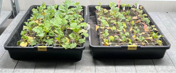 Grafika 3: Zestaw różnych odmian testowanych pod kątem tolerancji na werticiliozę w teście szklarniowym. Siewki są inokulowane 10 dni po siewie poprzez zanurzenie w zawiesinie zarodników, a następnie ponownie sadzone w wielodoniczkowych paletach. Po 14 dniach w standardowych warunkach klimatycznych oceniane są objawy infekcji werticiliozą. Źródło: Rapool, 2024.