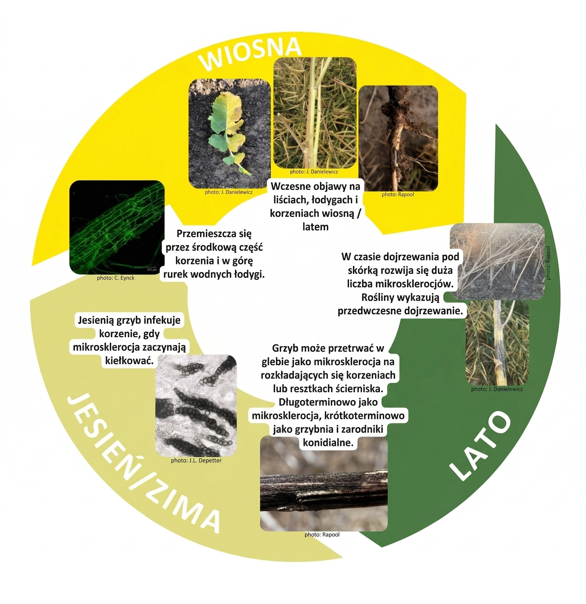 Grafika 1: Cykl rozwojowy patogena Verticillium longisporum wywołującego suchą zgniliznę łodyg (wertycyliozę) rzepaku. Źródło: RAPOOL 2026